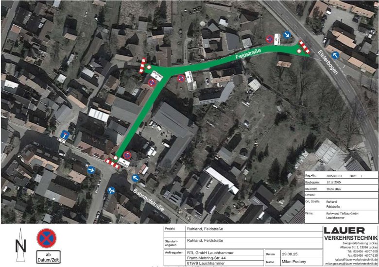 Derzeit führt die Firma Rohr- und Tiefbau GmbH in der Feldstraße in Ruhland unter Gesamtsperrung des Verkehrs die Straßensanierung aus. Die Gesamtsperrung dauert bis ca. 30.04.2026 an.