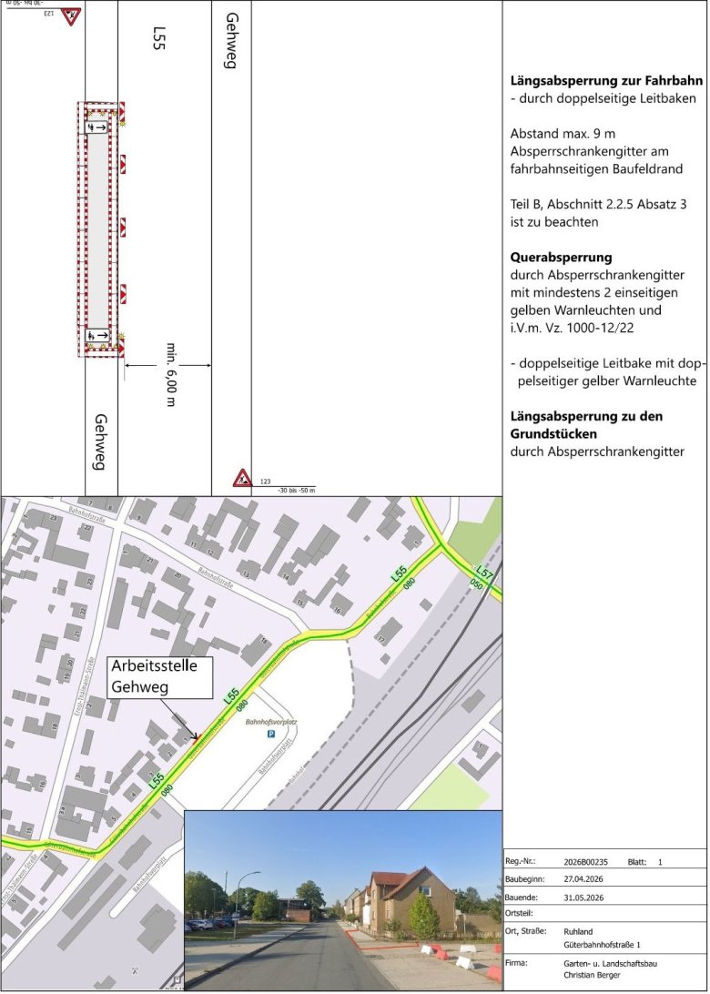 Vom 27.04.2026 bis voraussichtlich 31.05.2026 erfolgt durch die Firma Garten- u. Landschaftsbau Christian Berger die Anpassung des Gehweges an die neue Grundstücksgrenze zum Grundstück Güterbahnhofstraße 1 in Ruhland.