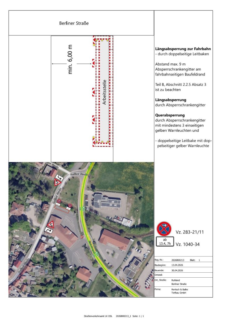 Aufgrund von Tiefbauarbeiten im Auftrag der MitNetz ist ein Teil des LIDL-Parkplatzes (Zufahrt von Berliner Straße) im Zeitraum vom 13.04.2026 bis voraussichtlich 30.04.2026 nicht zum Parken verfügbar.