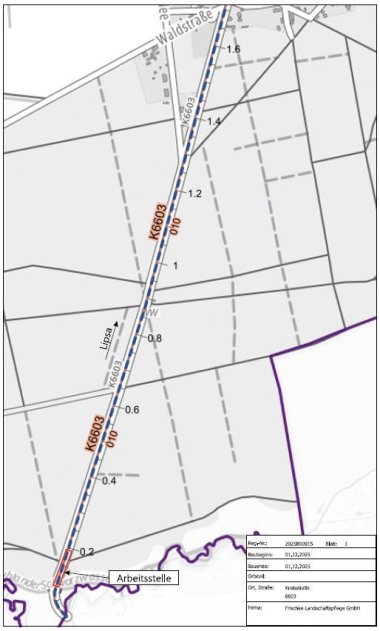 Am 01.12.2025 führt die Firma Frischke Landschaftspflege GmbH im Auftrag des Landkreises Oberspreewald-Lausitz auf der K6603 Baumschnittarbeiten im Waldrandbereich unter halbseitiger Straßensperrung aus.